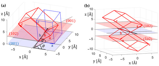 In Figure 2a, the rotation of the unit cell around the zone axis out of the xy plane is graphically demonstrated. The vector of the rotation axis is determined by ψ, which is the angle between the x axis and the rotation axis, and ϕ is the angle between the xy plane and the (001) plane of the rotated unit cell.