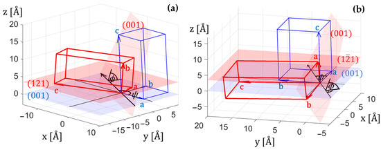 Therefore, inverting the sign of the Laue indices ki has no effect. The orientation of the unit cell, however, is affected, as the sign of the factor f2 in Equation (5) must change, i.e., f2 → −f2. Thus, the vector of the rotation axis changes its direction but the rotation angle remains the same. The resulting geometry is graphically shown in Figure 3b; the obtained rotation parameters are listed in Table 2. The resulting contact plane is then (. In static GIXD, the diffraction peaks of these two contact planes overlap. The same argument is valid for the contact planes ( and (. The formulae for the rotational parameters in monoclinic systems can be found in Appendix C. In Table 2, the calculated values for the orientation parameters in all four possible cases are listed.