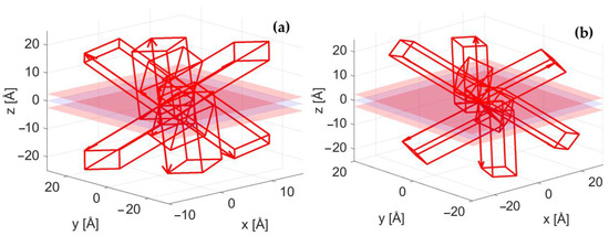 Sketch of the possible orientations of the tetragonal unit cell of binaphthalene (BNP) for (a) u = ±1, v = ±2, and w = ±7 and (b) u = ±2, v = ±1, and w = ±7. The contact planes (colored in red) are parallel to the xy plane (colored in blue), for w = 7 in the positive z direction and for w = −7 in the negative z direction. Note that there are no rotational symmetries around the z axis; only mirror symmetries exist.