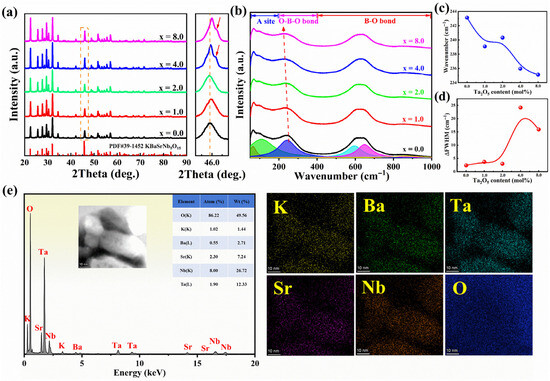 In order to investigate the change in the local structure of the glass ceramics with the addition of Ta2O5, the Raman spectrum was tested, as shown in Figure 1b. Similar to other ceramics with tungsten bronze structures reported in the literature, KBSN-xTa2O5 (x = 0.0, 1.0, 2.0, 4.0 and 8.0 mol%) glass ceramics exhibited the same vibration modes [23]. The Raman peaks in the region below 200 cm−1 (the two deconvoluted peaks marked by dark yellow and green in Figure 1b) were closely related to the vibrations of A-site cations, including K+, Ba2+, and Sr2+ [23]. The Raman peaks in the wavenumber range of 200–1000 cm−1 could be attributed to the internal mode of the BO6 octahedron, including Nb5+ and Ta5+. The peaks around 250 cm−1 (the deconvoluted peak marked in blue in Figure 1b) were attributed to the bending vibration of O-B-O bonds, while the peaks around 630 cm−1 (the two deconvoluted peaks marked in cyan and magenta in Figure 1b) and 840 cm−1 (the deconvoluted peak marked by yellow in Figure 1b) were associated with the stretching vibrations of B-O bonds [14,22,24]. As shown in Figure 1b, the Raman peaks of B-bonds became weaker in intensity and wider in shape with increasing Ta2O5 content, which indicated the weakening of Nb-O and O-Nb-O bonds; additionally, the disorder of B-site increased and the polarity of units decreased, leading to a decrease in the dielectric constant [25,26]. Furthermore, as shown to Figure 1c, the peaks around 200 cm−1 shifted to lower wavenumber values, associated with the displacement of B-site cations, due to the higher atomic mass of Ta compared to Nb [20]. Figure 1d shows the absolute value (ΔFWHM) of the FWHM difference between the two subpeaks in the 600 cm−1 band; it can be clearly observed that the ΔFWHM increased sharply when x ≥ 4.0, which could be attributed to the weakening of one of the peaks and the enhancement of the other. Furthermore, two peaks gradually merged into one peak, indicating a changing structural symmetry. This change may have been related to the change of the space point group from the non-centrosymmetric of P4bm to the centrosymmetric of P4/mbm owing to the transformation of the crystal structure due to Ta substitution.