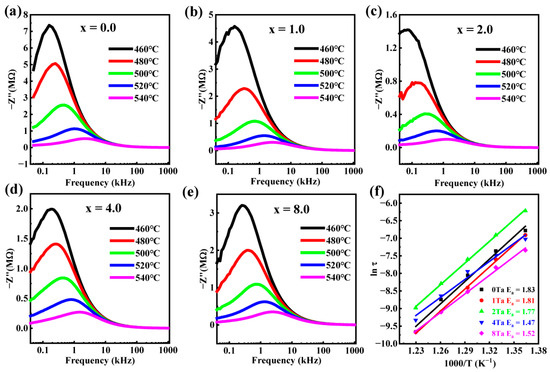 (a–e) Relationship between the imaginary part of impedance (−Z″) and the frequency of KBSN-x Ta2O5 (x = 0.0, 1.0, 2.0, 4.0 and 8.0 mol%) glass ceramics at different temperatures; (f) lnτ as a function of 1000/T for the glass ceramics.