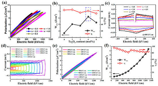 (a) The room temperature P-E loops of KBSN-xTa2O5 (x = 0.0, 1.0, 2.0, 4.0 and 8.0 mol%) glass ceramic at the critical electric field; (b) the change of energy storage density and efficiency with the increase of Ta2O5 content; (c) I-E loops at 400 kV/cm; (d) I-E loops with x = 4.0 components under various electric fields; (e) P-E loops under various electric fields; (f) variation of Wrec and η with electric field (the black and red arrows present the curves of Wrec and η depends on the electric field strength).