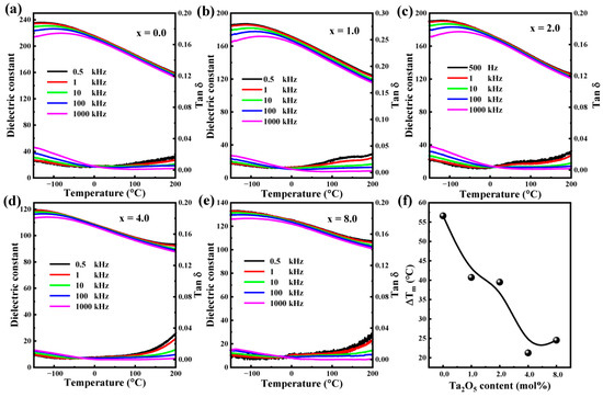 Temperature dependence of dielectric constant and loss for KBSN-xTa2O5 glass ceramics measures at frequencies of 0.5 kHz, 1 kHz, 10 kHz, 100 kHz, and 1000 kHz, (a) x = 0.0, (b) x = 1.0, (c) x = 2.0, (d) x = 4.0, and (e) x = 8.0; (f) the ΔTm of KBSN-xTa2O5 glass ceramics.