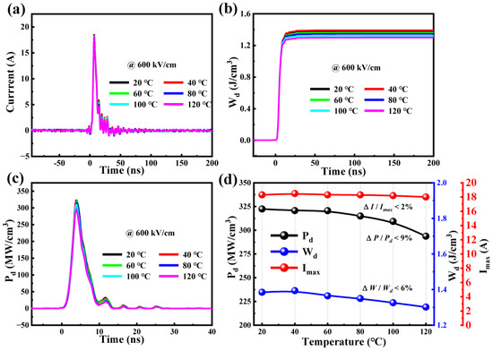 (a) Overdamped discharge current, (b) energy density, and (c) instantaneous power density curves of the KBSN-4.0mol%Ta2O5 glass ceramics at different temperatures under 600 kV/cm; (d) corresponding values of Pd, Wd, and Imax versus temperature.