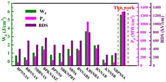 Comparison of discharge energy density (Wd), power density (Pd), and BDS with those in other glass ceramics systems.