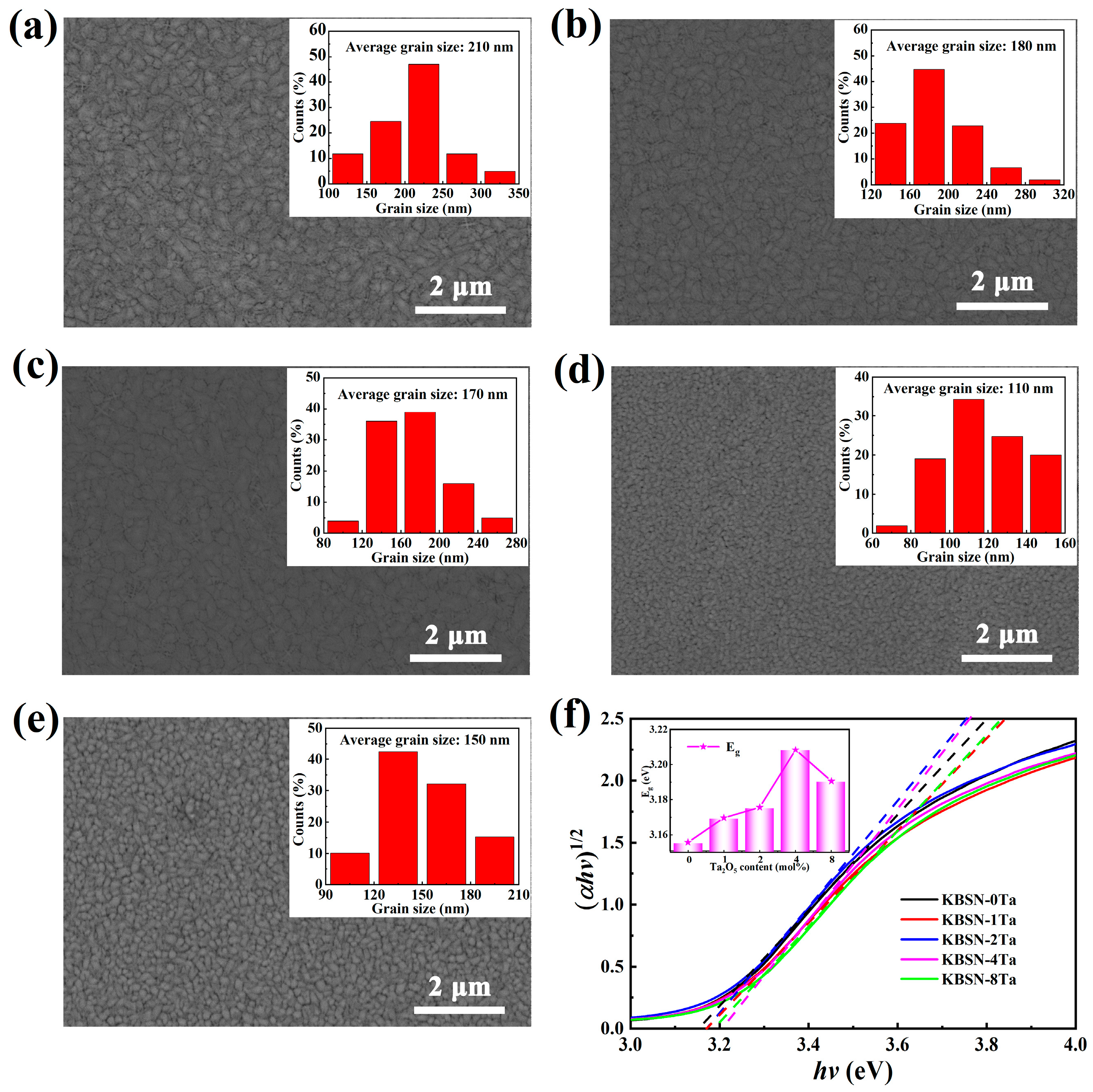Scanning electron microscope (SEM) images of the KBSN-xTa2O5 (x = 0.0, 1.0, 2.0, 4.0 and 8.0 mol%) glass ceramics are displayed in Figure 2a–e. Obviously, for all samples, the crystal grains were uniformly embedded in the glass matrix, forming a dense microstructure without obvious pores and crystal grain aggregation. The inset of Figure 2a–e shows the grain size distribution; it is clear that the crystal particles were at the nanoscale in all samples. Furthermore, the grain size became more uniform and smaller after the addition of Ta2O5. Notably, when the Ta2O5 addition was 4.0 mol%, the average grain size was significantly reduced to 90 nm, i.e., nearly 60% less than that of the sample without the addition of Ta2O5. A dense internal structure and small grain size are conducive to a high electric breakdown strength (BDS) [22,27,28,29]; thus, the KBSN-4.0mol%Ta2O5 glass ceramics may have had the highest BDS among all samples. The UV-vis absorption spectra of KBSN-xTa2O5 glass ceramics and corresponding optical band gaps (Eg) are shown in Figure 2f. Obviously, with an increase of Ta2O5 content, the trend of Eg increased first and then decreased; this is the same trend as the average grain size variation observed by SEM. When the addition amount of Ta2O5 was 4 mol%, the maximum value of Eg reached 3.205 eV. A wider band gap makes it more difficult for electrons in the valence band to jump into the conduction band, which served to improve the BDS [30].