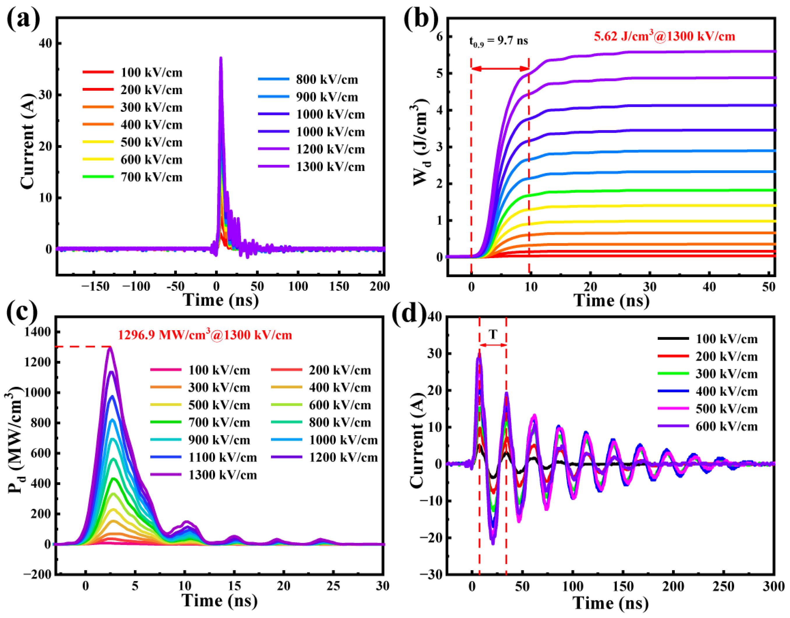 (a) Overdamped discharge current curves, (b) discharge energy density, and (c) instantaneous discharge power density curves of the KBSN-4.0mol%Ta2O5 glass ceramics under various electric fields; (d) underdamped discharge current curves versus time under different electric fields.