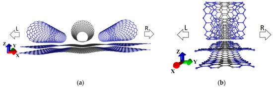 Device structure as a channel enclosed between two electrodes as part of graphene–SWCNT (16,0) all-carbon film for calculating electron transport along X (a) and Y axes (b). The left (L) and right (R) electrodes are blue. The channel is gray.