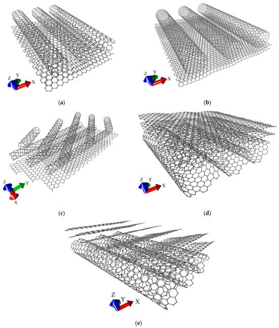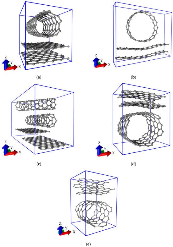 The relaxed structures of considered supercells are shown in Figure 2. The first structural configuration (V1) is formed by armchair (5,5) SWCNTs and AA-stacked bilayer graphene (see Figure 2a). The second structural configuration (V2) is formed by zigzag (16,0) SWCNTs and AA-stacked bilayer graphene (see Figure 2b). In the first two configurations, nanotubes are oriented in the “armchair” direction of the hexagonal graphene lattice (along the Y axis). The third structural configuration (V3) is represented by two layers of zigzag (6,0) SWCNTs located on AB-stacked bilayer graphene (see Figure 2c). The upper layer of SWCNTs is rotated relative to the lower one at an angle of 45⁰. The lower layer of SWCNTs is oriented along the “armchair” direction of the hexagonal graphene lattice. The fourth structural configuration (V4) is formed by (12,6) SWCNTs and AB-stacked bilayer graphene (see Figure 2d). Finally, the fifth structural configuration (V5) is formed by (8,4) SWCNTs and AB-stacked bilayer graphene (see Figure 2e). Unlike the first three configurations, the bilayer graphene in configurations V4 and V5 is located above the nanotube. The main difference between the structural configurations V4 and V5 is the orientation of the bilayer graphene with respect to the nanotube. In V5 configuration, the graphene layers are positioned at an acute angle to the nanotube, unlike V4 configuration, where both layers are located exactly above the nanotube. In structural configurations V3, V4, and V5, the nanotubes and graphene overlap, creating regions (“islands”) of increased carbon density in the graphene–SWCNT hybrid structure. In what follows, we will refer to this topology as an island-type topology. This is consistent with known experimental data [6]. For structural configurations V2, V4, and V5, the deformation of bilayer graphene and SWCNTs is observed. This is due to the larger diameter of SWCNTs and the smaller sizes of graphene fragments in the supercell compared to configurations V1 and V3. The consequence of this is a stronger mutual influence of the nanotube and graphene in the V2, V4, and V5 structural configurations. The extended fragments of all-carbon films are presented in Figure 3. These fragments were obtained as a result of translation of supercells shown in Figure 2 along the X and Y axes. Figure 3d,e clearly demonstrates the above-mentioned difference in the mutual orientation of SWCNTs and graphene fragments between structural configurations V4 and V5.