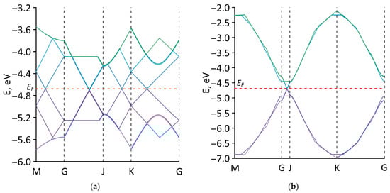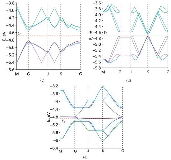 To identify the features of the electronic properties of the studied all-carbon films, the band structure calculations using a basis of p-orbitals were carried out. The first Brillouin zone for all structural configurations of all-carbon films was rectangular. Figure 5 presents energy band diagrams of all-carbon films near the Fermi level EF. The EF values for each structural configuration of all-carbon films are given in Table 2. Configurations V1 (Figure 5a), V2 (Figure 5b), and V5 (Figure 5e) have a gapless band structure, which is typical for materials with a metallic conductivity. Configurations V3 and V4 have an energy gap in the band structure. The energy gap of the V3 configuration is several tenths of an electron volt (see Figure 5c). For the V4 configuration, the energy gap is insignificant and amounts to ~0.05 eV (see Figure 5d). The values of the energy gap Egap of all-carbon films are presented in Table 2.
