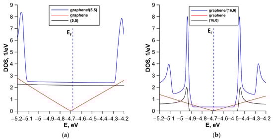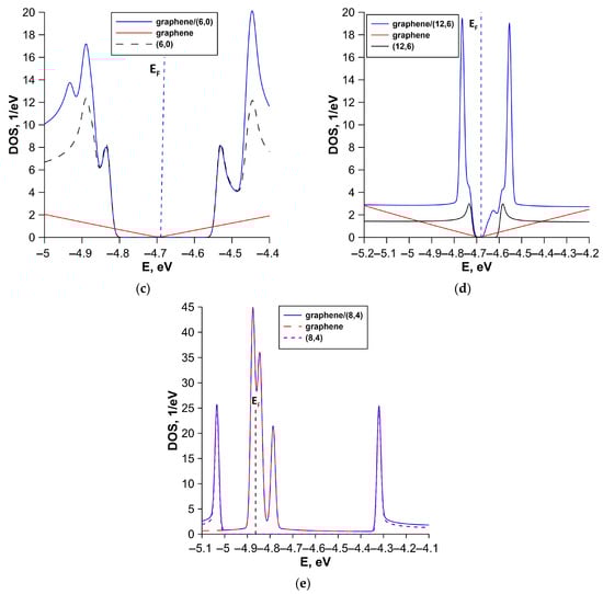 To interpret the obtained energy band diagrams, we calculated the DOS distribution for each structural configuration. Our task was to establish the patterns of formation of the profile of DOS of all-carbon films. Figure 6 shows calculated DOS of all-carbon films and their components (individual SWCNT and bilayer graphene). Individual fragments of SWCNTs and bilayer graphene were cut from supercells of all-carbon films (see Figure 2). The gapless band structure of the V1 structural configuration is due to the metallic conductivity of both graphene and (5,5) SWCNT. In this case, the DOS profile of all-carbon film near the Fermi level EF completely repeats the DOS profile of the (5,5) SWCNT (see Figure 6a). The contours of the DOS profile of the V2 structural configuration largely repeat the contours of the DOS profile of the semiconductor (16,0) SWCNT (see Figure 6b). However, the gapless band structure of all-carbon film in this case is determined by the bilayer graphene, which is predominant in a quantitative ratio in the supercell of the V2 structural configuration. The semiconductor conductivity of the V3 structural configuration is attributed to the twisted structure of the SWCNT bilayer. The bilayer of (6,0) SWCNTs is characterized by an energy gap of 0.28 eV as is the graphene–(6,0) SWCNT film (see Figure 6c). A similar energy gap opening effect was previously established for twisted bilayer graphene [63]. The electronic structure of (12,6) SWCNT determines features of the electronic properties of V4 structural configuration. This is evidenced by the similarity of the profiles of DOS of (12,6) SWCNT and graphene–(12,6) SWCNT film (see Figure 5d). The small energy gap in the profile of DOS of graphene–(12,6) SWCNT film is caused by the deformation of (12,6) SWCNT during interaction with bilayer graphene. AB-stacked bilayer graphene plays a decisive role in the gapless band structure of the V5 structural configuration. The profile of DOS of AB-stacked bilayer graphene near the Fermi level completely repeats the contours of the profile of DOS of graphene–(8,4) SWCNT film. As is known, the electronic properties of a nanomaterial are determined precisely by the electronic states near the Fermi level. In addition, Table 2 shows that the Fermi level EF is –4.68 eV ÷ –4.69 eV for most of the considered structural configurations of all-carbon films, with the exception of V5. For this structural configuration, the Fermi level EF is –4.86 eV, as for the AB-packed bilayer graphene included in the graphene–(8,4) SWCNT film.
