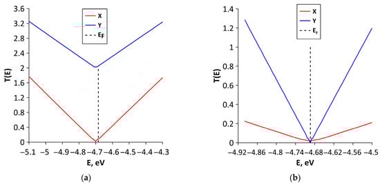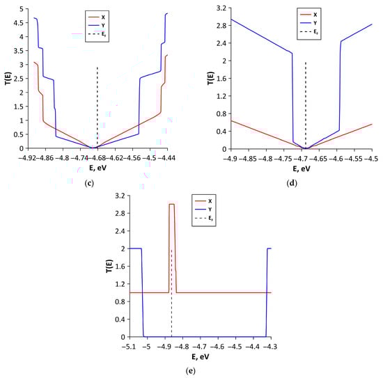 To explain the reasons for the observed anisotropy of electrical conductivity, we plotted graphs of the function T(E), called the transparency coefficient of the potential barrier. Figure 7 shows the T(E) graphs of studied all-carbon films for two directions of electron transport. For structural configurations V1 (Figure 7a), V2 (Figure 7b), and V4 (Figure 7d), the T(E) values near EF for electron transport along Y axis are several times greater than those along the X axis. That is, there are more conduction channels for electron transport in the direction of the Y axis. This explains the lower values of resistances Ry of these structural configurations. In turn, Figure 7c,e demonstrate that for structural configurations V3 and V5, the T(E) values near EF for electron transport along the X axis are greater than those along the Y axis. This difference is especially noticeable for V5 structural configuration. For this configuration, the T(E) takes a maximum value of three near EF for electron transport along the X axis. Along the Y axis, T(E) has a transport gap of ~0.7 eV.
