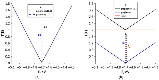 where is the channel energy level broadening due to the source contact, is the channel energy level broadening due to the drain contact, and and are the retarded and advanced Green’s functions. Figure 1 shows the device structure for the calculation of quantum electron transport using the graphene–(16,0) SWCNT hybrid structure as an example. The electrodes (the source and drain contacts) and the channel are supercells of graphene–(16,0) hybrid film. Two directions of electron transport were considered: along the X axis (the “zigzag” direction of the graphene hexagonal lattice) and along the Y axis (the “armchair” direction of the graphene hexagonal lattice). The electrodes are semi-infinite along the X axis and infinite along the Y axis, with quantum electron transport along the X axis (Figure 1a). The electrodes are semi-infinite along the Y axis and infinite along the X axis, with quantum electron transport along the Y axis (Figure 1b).