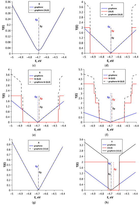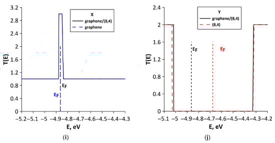 The analysis of the T(E) curves for electron transport along the Y axis allows us to conclude that nanotubes make a significant contribution to the T(E) profile for studied structural configurations of all-carbon hybrid films. For the V1 (Figure 8b) and V5 (Figure 8j) structural configurations, the contribution of nanotubes is decisive to the T(E) profile. Let us consider these cases in more detail. For electron transport along the Y axis, the profile of T(E) of graphene–(5,5) SWCNT film follows the contours of T(E) of bilayer graphene, but the T(E) plot is shifted along the ordinate axis by two units. This is due to the influence of the (5,5) nanotube. It is conductive in this direction of electron transport and has a T(E) function equal to two over the entire energy range under consideration. Charge transfer also occurs between the bilayer graphene and (5,5) SWCNT. As a result, a partial charge of 0.14e is transferred from the (5,5) SWCNT to the bilayer graphene (Figure 9e). Since both AA-stacked bilayer graphene and (5,5) SWCNT exhibit metallic conductivity, the graphene–(5,5) SWCNT hybrid structure is characterized by the highest T(E) value for electron transport along the Y axis. As a consequence, the V1 configuration has the lowest electrical resistance Ry among the considered structural configurations of all-carbon hybrid films. During electron transport along the Y axis, the T(E) profile of graphene–(8,4) SWCNT film near EF (–4.863 eV) completely repeats the T(E) of (8,4) SWCNT, which has a transport gap of 0.7 eV. In this case, the bilayer graphene makes a minor contribution. As noted above, the supercell of the V5 structural configuration includes graphene fragments in the form of zigzag nanoribbons. They conduct current in the “zigzag” direction (X axis) of the hexagonal graphene lattice. In this regard, the V5 structural configuration has the lowest resistance Ry among the considered structural configurations of all-carbon films.