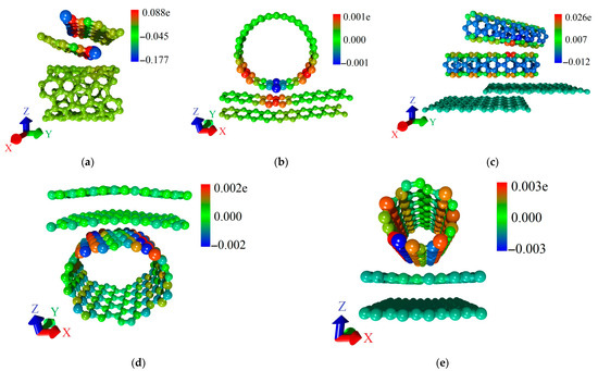 Distribution of partial Mulliken charge over atoms of supercell of various types of structural configurations of all-carbon films: (a) V5; (b) V2; (c) V3; (d) V4; and (e) V1.