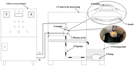 The experiment was conducted using an EPN setup equipped with a 40 kW DC power rectifier and a specialized treatment chamber containing a plasma torch, as shown in Figure 1. The nitriding process of the samples was carried out as follows: the working bath (5) was prefilled with the electrolyte. Using a pump (4) installed at the bottom of the bath, the electrolyte was directed through pipelines (8) to the plasma torch zone (3), which was located inside the processing chamber (2). After passing through the plasma torch, the electrolyte returned to the bath through drain openings, ensuring continuous fluid circulation. The electrolyte flow rate was maintained in the range of 4–7 L/min. To stabilize the electrolyte temperature within the range of 40–50 °C, a heat exchanger was used, into which cooling water was supplied at a flow rate of 3–6 L/min. The sample (6) was fixed in the holder in such a way that the treated surface was positioned at a distance of 2–3 mm from the opening of the conical partition. Through this opening, the electrolyte was supplied as a jet, simultaneously cooling the sample surface and helping to maintain the desired temperature. The anode (7) was connected to the positive terminal of the power supply (1), while the sample, serving as the cathode, was connected to the negative terminal. To rapidly heat the surface to the saturation temperature, a voltage of 320 V was applied to the sample for 10 s, after which the voltage was reduced to 180 V, and the treatment continued for 10 min. The sample temperature during the process was maintained within the range of 500–550 °C by regulating the electrolyte flow rate [22]. The selection of these parameters is based on preliminary studies and literature data [14,15], which indicate that a temperature range of 500–550 °C enables the formation of nitride layers without the brittle delta phase. However, nitriding was also carried out at temperatures of 650 and 750 °C to compare the changes in the characteristics of the nitrided layer depending on the temperature. Reducing the voltage from 320 V to 180 V after a short pulse ensures that the saturation temperature is reached and the plasma is stabilized, thereby preventing thermal damage to the surface.