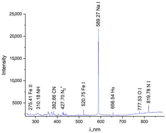 The obtained emission spectrum shown in Figure 2 allows for a qualitative analysis of the active species formed in the near-electrode region. The identification of Na I (589.27 nm), Fe I/II, NH, CN lines, as well as molecular ions N2+ and atomic nitrogen N I, confirms the presence of both ionized and excited neutral species in the plasma. Special attention should be paid to the intense peak at the wavelength of 589.27 nm, which corresponds to the resonance D-line of neutral sodium. This is due to the fact that the Na I 589.0/589.6 nm line is weakly sensitive to self-absorption [20,21]. The surge at 427.70 nm (N2+) indicates the presence of molecular ions characteristic of excited nitrogen plasma, which plays a key role in the formation of the nitride layer. The presence of CN and NH radicals indicates the involvement of carbon- and hydrogen-containing components, originating from carbamide and ammonium in the electrolyte, in the complex chemical kinetics of the nitriding process.
