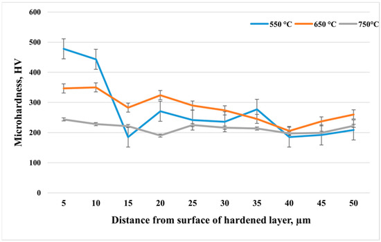 Figure 3 shows the microhardness distribution with depth from the surface of 12Kh18N10T stainless steel after cathodic electrolytic plasma nitriding at different temperatures: 550 °C, 650 °C, and 750 °C. In all cases, the treatment duration was 10 min. At a temperature of 550 °C, the maximum microhardness—up to 480 HV near the surface—was observed, indicating intensive nitrogen saturation and the formation of nitride phases in the surface zone. However, at a depth of about 15 μm, a sharp decrease in hardness to approximately 180 HV is observed, likely corresponding to the boundary between the nitrided layer and the unsaturated matrix. Beyond this point, the microhardness stabilizes at around 220–250 HV, which corresponds to the original austenitic structure of the steel. At a temperature of 650 °C, a more uniform hardness profile is achieved without sharp drops. The surface value is about 350–360 HV, and an elevated hardness level is maintained throughout the entire depth, which may indicate deeper and more uniform nitrogen diffusion, but with less pronounced formation of high-hardness nitride phases compared to 550 °C. In the case of 750 °C, the maximum surface hardness is approximately 250 HV and decreases to around 200 HV with depth. This behavior can be explained by the possible dissolution of nitrides and the reversion to the austenitic phase due to overheating, as well as enhanced diffusion and recrystallization processes that reduce the strengthening effect.