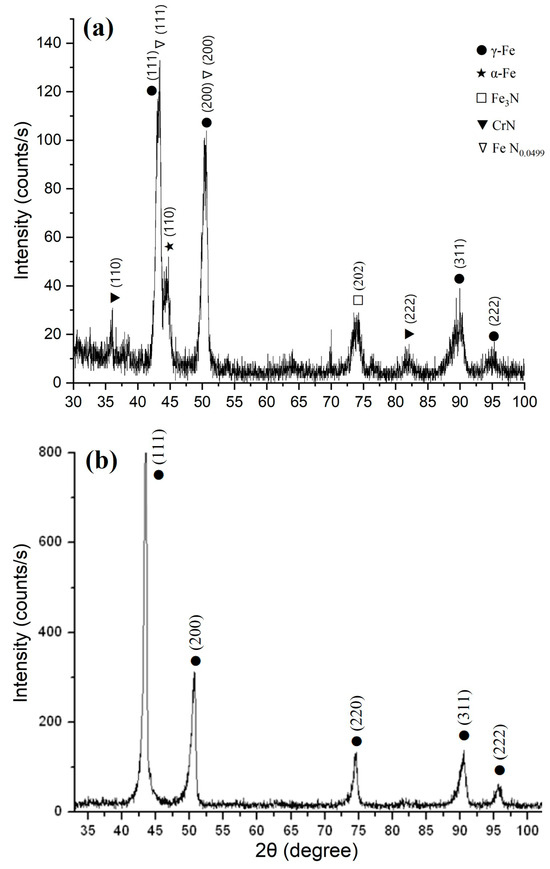 X-ray structural analysis of the 12Kh18N10T steel surface before and after electrolytic plasma nitriding (Figure 4) revealed significant changes in the phase composition. In the initial state, intense diffraction reflections corresponding to the γ-phase (austenite) along the (111), (200), (220), (311), and (222) planes were observed, confirming the stability of the austenitic lattice and the structural homogeneity of the material prior to treatment (Figure 4b). After nitriding, the main γ-Fe peaks remained, but additional reflections were identified corresponding to the Fe3N phase (202 reflection), CrN phase (111 and 200 reflections), α-Fe phase (110 reflection), as well as a solid solution of nitrogen FeN0.0499 in γ-Fe (111 and 200 reflections) (Figure 4a). The presence of nitride phases indicates successful surface saturation with active nitrogen species, while the detection of the α-phase may suggest local destabilization of the austenitic structure due to the thermal effect of the discharge. The broad and low-intensity reflections of the nitrogen solid solution indicate the initial stage of nitrogen incorporation into the austenitic lattice. The reduced intensity of γ-phase reflections compared to the initial state further confirms the partial redistribution of the crystalline structure. The obtained results are consistent with emission spectroscopy data, which recorded active nitrogen species in the plasma (N2+ at λ = 427.7 nm and N I at λ = 819.8 nm), providing a high nitriding potential under the investigated conditions [28].
