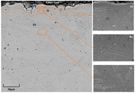 Cross-section of austenitic stainless steel 12Kh18N10T after EPN, obtained using SEM at ×300 magnification. I—nitride zone; II—transition zone; III—initial structure. (a–c) SEM images of the corresponding layers at ×2000 magnification.