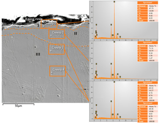 Energy-dispersive X-ray spectroscopy (EDX) of austenitic stainless steel 12Kh18N10T after electrolytic plasma nitriding. I—nitride zone; II—transition zone; III—initial structure.