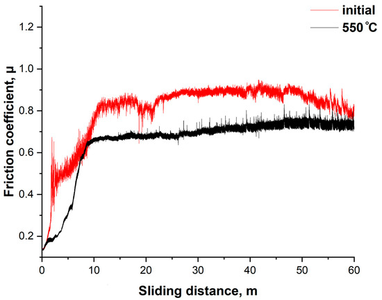 The dependence of the friction coefficient on the sliding distance for the initial sample and the sample after EPN at 550 °C.