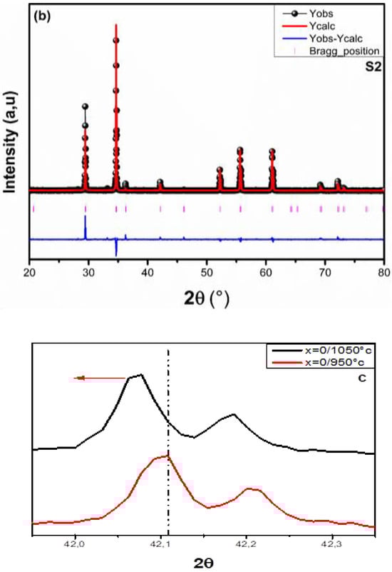 The X-ray diffraction (XRD) patterns for Cd0.6Mg0.2Cu0.2Fe2O4 ferrites frit at two different temperatures (950 °C and 1050 °C) are illustrated in Figure 2a,b. We observed the absence of additional impurity-related peaks signifies the high purity of our synthesized samples. As the calcination temperature increases, the peaks in the XRD patterns demonstrate an increase in intensity and sharpening, indicative of improved crystallinity and enlargement of the nanoparticles. This phenomenon is reflected in the observed decrease in peak width alongside an increase in peak intensity, which suggests a thermally activated enhancement of the crystalline structure at higher temperatures. Furthermore, the lattice parameters and cell volume exhibit an upward trend with elevated sintering temperatures, pointing to lattice relaxation processes occurring at these temperatures [42,43,44,45]. The peak positions in the XRD patterns exhibit slight shifts toward lower diffraction angles as shown in Figure 2c, leading to an increase in lattice constant (a) according to the following relation [43]: