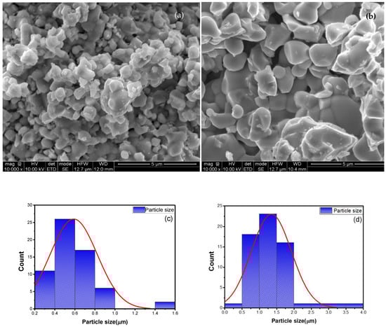 The SEM images presented in Figure 3a,b for Cd0.6Mg0.2Cu0.2Fe2O4 compounds demonstrate a uniform distribution of grain shapes across both samples. The calcination temperature plays a crucial role in influencing the size, arrangement, and morphology of the grains. In this study, Cd0.6Mg0.2Cu0.2Fe2O4 compounds were synthesized at elevated calcination temperatures of 950 °C and 1050 °C. These higher temperatures were employed to enhance the crystallinity of the compounds and achieve a homogeneous microstructure. The particle size distributions were meticulously evaluated using ImageJ software, as illustrated in Figure 3c,d. It was observed that increasing the calcination temperature leads to a significant enlargement of particle size. Specifically, the particle sizes were approximately 0.60 µm at a calcination temperature of 950 °C and increased to around 1.35 µm when the temperature was raised to 1050 °C. This enlargement can be attributed to the enhanced atomic mobility and grain growth facilitated by the higher calcination temperatures, ultimately contributing to improved material properties.