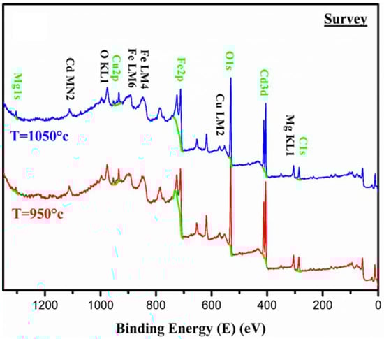 The XPS technique was employed to investigate the surface properties of the materials. The chemical environment and oxidation states of the elements influence the binding energy of the peaks, providing insights into the cation distribution and defect states in the spinel structure. The survey spectra of samples S1 and S2, shown in Figure 4, along with the XPS composition data in Table 2, confirm the presence of all expected elements (Cd, Mg, Cu, Fe, and O), as well as adventitious carbon, indicating the high purity of the synthesized material.