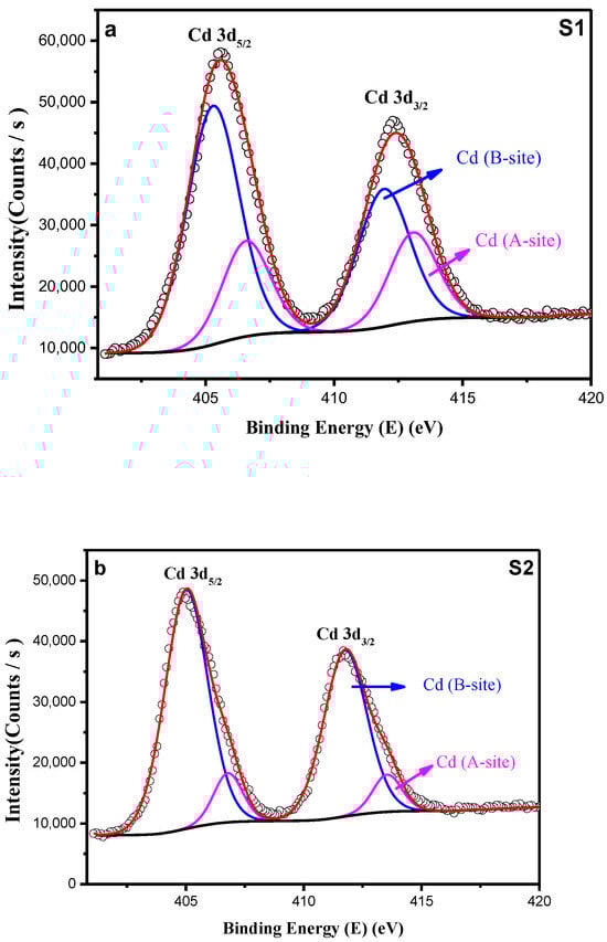 A detailed analysis of the Cd 3d spectrum, shown in Figure 6a,b, reveals that the Cd 3d5/2 and Cd 3d3/2 lines can be fitted to two distinct peaks. The higher binding energy peaks (406.58 eV for S1 and 406.79 eV for S2) correspond to Cd2+ ions on octahedral sites, while the lower energy peaks (405.29 eV for S1 and 405.02 eV for S2) correspond to Cd2+ ions on tetrahedral sites. The Cd2+ (octahedral)/Cd2+ (tetrahedral) ratio increases with rising calcination temperature, as indicated in Table 3. This shift in cation distribution is consistent with the lattice expansion observed in XRD results (Table 1).