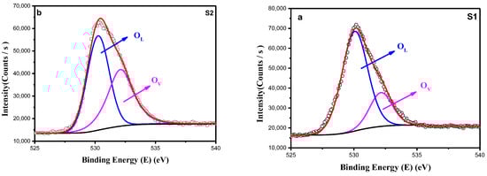 The O 1s spectra, commonly more informative about oxide ferrite structures than the cation spectra, exhibit slightly asymmetric shapes that can be fitted by two Gaussian curves: O1 and Ov peaks (Figure 9a,b). The O1 peak, located near 530 eV, corresponds to oxygen atoms in the lattice [60], while the Ov peak (532.05 eV for S1 and 532.10 eV for S2) is attributed to hydroxyl groups, chemisorbed oxygen, and organic oxygen on the sample surface [61]. Naeem et al. report that the Ov peak is associated with an increase in oxygen vacancies [62]. Table 4 lists the relative abundance of these oxygen species, revealing that surface oxygen vacancies increase with higher calcination temperatures. These vacancies are crucial for catalytic activity, as they provide the active oxygen species necessary for redox reactions [63].