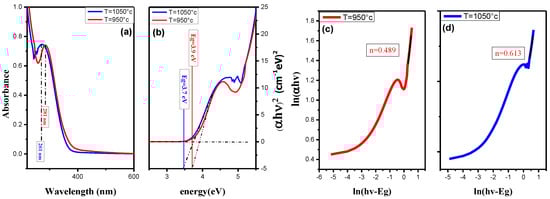 Figure 10a illustrates the absorbance (A) as a function of wavelength (λ) of Cd0.6Mg0.2Cu0.2Fe2O4 spinel ferrites across the ultraviolet (UV) and visible (VIS) radiation domains. The spectra exhibit a prominent absorption band within the UV range, specifically between 200 nm and 400 nm. This finding indicates that these ferrites effectively absorb UV light. Consequently, they present significant potential for applications in UV light absorption and photocatalysis [64,65]. As the calcination temperature increased, the peak absorption wavelength shifted from λ = 281 nm at 950 °C to λ = 261 nm at 1050 °C. Furthermore, a noticeable blue shift in the peak absorption was observed with an increase in particle size. To estimate the band gap energies, Tauc’s law [66] was employed to provide a systematic approach for determining the optical band gap based on the relationship between the absorbed energy and the absorption coefficient.