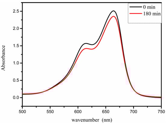 UV–visible absorption profile of methylene blue during photodegradation without additives or catalysts.