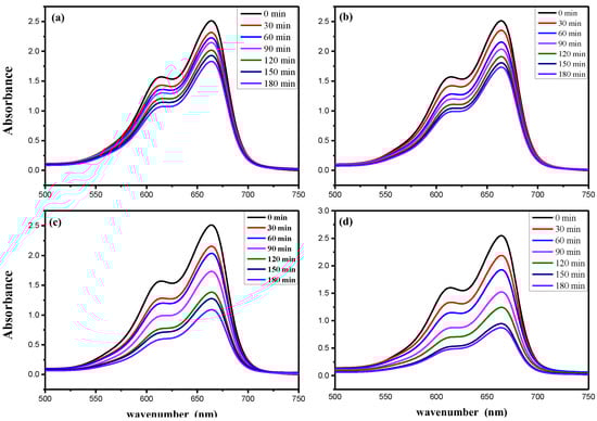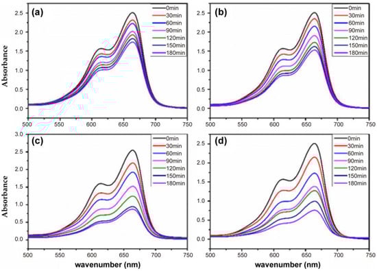 Time-dependent absorption spectra of MB solution in UV light with different catalyst concentrations (S1): (a) 5 mg, (b) 10 mg, (c) 20 mg, and (d) 40 mg.