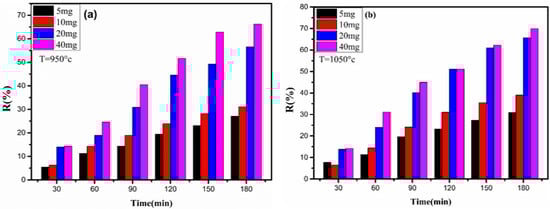 where η represents the degradation efficiency, A0 is the initial dye concentration, and At is the dye concentration at a specific time interval. The efficacy of different catalyst contents (5, 10, 20, and 40 mg) on the photodegradation of the dye is shown in Figure 14a,b. It is generally observed that the photodegradation efficiency increases with irradiation time. For the samples calcined at 950 °C, the degradation efficiency ranged from 5.44 to 27.07, 6.30 to 31.09, 13.99 to 56.57, and 14.32 to 66.23% for x = 5, 10, 20, and 40 mg, respectively, over irradiation times from 30 to 180 min. In contrast, the samples calcined at 1050 °C showed efficiencies ranging from 7.67 to 30.91, 6.53 to 38.99, 14.11 to 65.69, and 14.49 to 69.84% for x = 5, 10, 20, and 40 mg, respectively, indicating enhanced photocatalytic performance at higher calcination temperatures (Figure 14b). The most significant decolorization of methylene blue was observed with a catalyst concentration of 40 mg and an irradiation time of 180 min. This may be due to the increased generation of photo-generated electron–hole pairs over time, leading to more hydroxyl groups and active sites that assist in greater adsorption of reactants on the photocatalyst surface, ultimately resulting in the degradation of organic dye pollutants [74,75,76]. A comparative table of degradation efficiencies of ferrites reported in the literature has been prepared (Table 6) to contextualize the performance of the synthesized material and highlight its specific advantages.