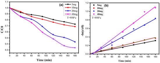 The amount of catalyst plays a significant role in the photodegradation rate. In the present study, the decolorization efficiency of Cd0.6Mg0.2Cu0.2Fe2O4 on the photodegradation of methylene blue was evaluated for different catalyst concentrations ranging from 5 to 40 mg, as shown in Figure 14a,b. It can be seen from the figures that increasing the catalyst concentration from 5 to 40 mg enhanced the degradation rate to an optimal level. This enhancement can be attributed to the improved light absorption and more efficient generation of electron–hole pairs, which are crucial for initiating photocatalytic reactions.