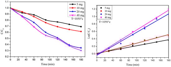 The study of the reaction kinetics for methylene blue (MB) dye degradation indicates that the reaction follows a pseudo-first-order kinetic model [87]. The rate constant k was determined using the Langmuir–Hinshelwood equation: