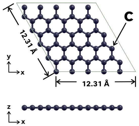 The unit cell considered includes 50 carbon atoms, and it has a side length of 12.31 Å in the a and b directions, as shown in Figure 1. The length of the unit cell in the c direction is 2.5 times that of the a and b directions, that is, 30.77 Å. This choice minimizes the spurious interactions between elements of the unit cell and their repetitions in adjacent unit cells, due to the use of periodic boundary conditions. In this way, the interactions at the graphene surface are modeled more accurately. We first performed a geometric relaxation calculation to optimize the structure of the graphene surface.
