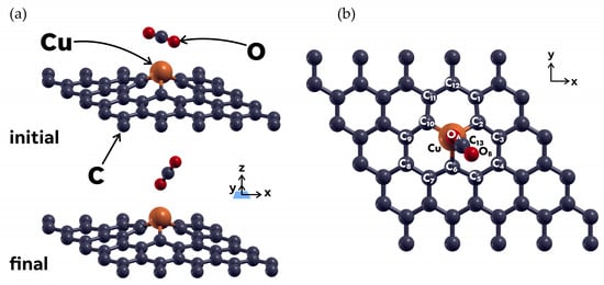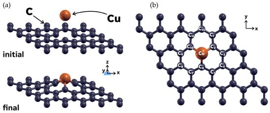 Table 1 shows the Löwdin charges for the Cu atom and the twelve carbon atoms nearest to it, for the initial and final configurations. The C atoms around the vacancy are labeled according to the labeling on Figure 2. The charges in Table 1 refer to the number of electrons present on each atom, concerning their valence charge. The partial charge values in the Löwdin charge analysis are meant to give a general idea of the reactivity, type of bond, or charge transfer direction for the selected atoms in the absorption process [].
