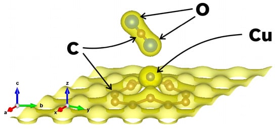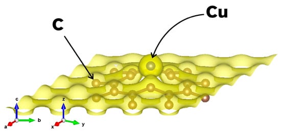 Figure 3 shows a charge density plot corresponding to the final optimized structure of the 49G + Cu system (see Figure 2a), after the Cu atom is chemisorbed by the graphene at the vacancy site. The isosurface level in Figure 3 was set to 0.1, indicating that 90% of the electrons in the systems are expected to be inside the surface.