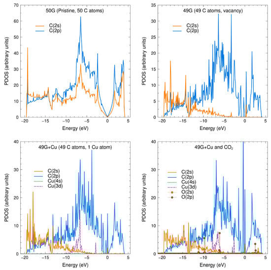 We then calculated the projected density of states (PDOS) for the cases considered in this work. Figure 6 shows the PDOS for said cases. We included the PDOS for the pristine graphene as a reference. The catalyzer effect of the Cu atom on the graphene surface is more evident at the bottom-right section of Figure 6, where the Cu 3d orbitals show signs of hybridization with the O 2p orbitals from the CO2 molecule. This is congruent with the charge transfer shown in the Löwdin analysis.