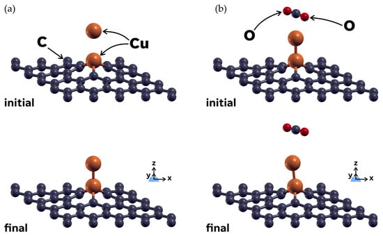Next, we explored the interaction between a CO2 molecule and the graphene surface with the substitutionally absorbed copper atom, which we labeled as 49G + Cu. The first calculation, using the PBE functional but no Van der Waals correction, showed no interaction between the carbon dioxide and the Cu-doped graphene surface. We then added Grimme’s DFT-D3 Van der Waals correction, and the structural relaxation showed that the CO2 molecule was physisorbed by the 49G + Cu system, with an adsorption energy of −0.1786 eV. Figure 4 shows the initial and final configurations for this case. The initial vertical distance between the CO2 and the functionalized graphene surface was 3 Å.