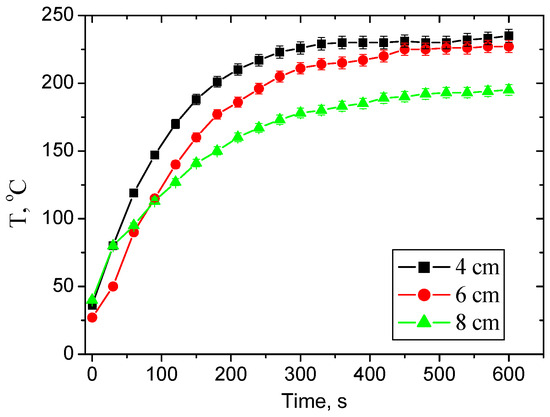 DC magnetron sputtering was utilized to synthesize the DLC and Mo-doped DLC (Mo-DLC) films, using two flat magnetron targets (graphite (Kurt J. Lesker Company, Saint Leonards, UK)) and molybdenum with 99.95% purity (Testbourne Ltd., Helmond, The Netherlands) of 3-inch diameter and 6 mm thickness; the films were formed on silicon (100) wafers. Before starting the deposition, the chamber was vacuumed until it reached a pressure of ~0.01 Pa. During the deposition, the chamber was filled with argon, and the pressure was ~3 Pa. The target currents were 1.5 A and 0.25 A for graphite and molybdenum targets, respectively. The pre-sputtering of magnetron targets was performed for 5 min in argon plasma to clean the surfaces (remove oxide layer or contaminants) of the material targets. Also, prior to the film’s deposition, the silicon substrates were cleaned with acetone to remove any oxide layers, dust, or contamination from the surface. A shield with a slit mount above the molybdenum target was utilized to control the flux of sputtered Mo atoms. The amount of Mo gradually increased by increasing the slit opening from 4 mm to 16 mm, when the deposition was carried out at a target–substrate distance of 4 cm. The literature provides specific conditions for synthesis [17]. The distance between the magnetron targets and the Si wafer varied from 4 cm to 8 cm to achieve different temperatures of deposition. The duration of synthesis of all films was 10 min. The temperature was recorded with a thermocouple attached to the sample holder. The evolution of the temperature versus deposition duration is given in Figure 1.