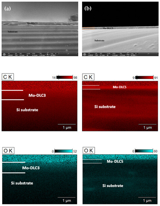 SEM cross-section views of the Mo-DLC3 (a) and Mo-DLC5 (b) films with the cross-section mapping images for carbon, oxygen, and molybdenum in both films.