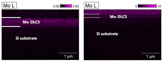 Cross-section images of the Mo-DLC3 and Mo-DLC5 films are presented in Figure 2. The increase in the deposition distance results in a slight reduction in the film thickness from ~210 nm to 150 nm. The elemental mapping cross-section images are shown in Figure 2, as well as in the column below for each Mo-DLC film. The images demonstrate that oxygen is more condensed on the coating at a higher deposition temperature of 235 °C than at a lower deposition temperature of 180 °C. Meanwhile, the Mo was distributed homogenously in the volume of the films, but a slightly higher Mo concentration in the coating was observed when the deposition temperature was 235 °C, compared to the film deposited at 180 °C. The elemental mapping cross-section images indicated that the molybdenum is evenly distributed throughout the whole volume of the Mo-doped DLC films. The oxygen was also evenly distributed throughout all volumes of the films (Figure 2). It was found that the oxygen concentration on the surface of the Mo-DLC films was higher compared to the volume data, as the color (intensity of the obtained signal) was more intense. There is no agglomeration or formation of larger-sized Mo clusters in the films. The thicknesses of the deposited films were determined using SEM images and compared to the EDX data. It was observed that the average thickness of the DLC film was ~180 nm. The addition of the molybdenum slightly enhanced the films’ thicknesses. The Mo-DLC1, Mo-DLC2, and Mo-DLC3 films’ thicknesses were ~210 nm, ~210 nm, and ~205 nm, respectively. Meanwhile, the increase in the deposition distance resulted in a reduction in thicknesses to ~180 nm and ~150 nm for the Mo-DLC4 and Mo-DC5 films, respectively.