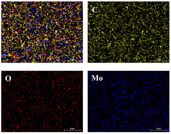 Figure 3 illustrates the elemental mapping images of the Mo-DLC5 film. The mapping images show a smooth coating with a relatively even distribution of the oxygen and molybdenum on the measured area of the Mo-DLC5 film. It can be seen that there are no large molybdenum clusters or grains in the film with a size of 10 µm or larger dimensions (Figure 3). Although the synthesis temperature varied from 180 °C to 235 °C depending on the distance used, the Mo atoms are distributed quite evenly without segregation into larger clusters.