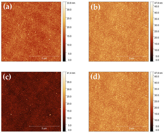 The Mo-DLC films’ surface morphology images are presented in Figure 4. The AFM images confirmed that the deposited Mo-DLC films are uniform and demonstrate a continuous morphology. Additionally, the AFM surface images indicated an absence of cracks and that the nanoaggregates are equally distributed over the whole surface area of the films (Figure 4).
