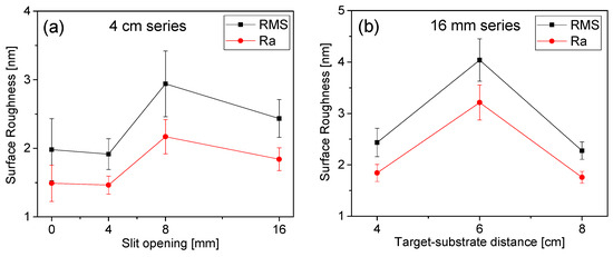 The surface roughness data were plotted against the slit opening width and deposition distance (temperature) in Figure 5. The variation in the target–substrate distance, as well as the slit opening, has limited influence on the surface roughness values, as shown in Figure 5.
