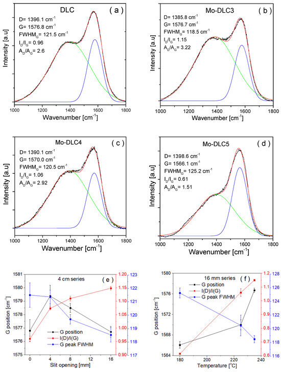The Raman spectra of DLC films primarly concentrate on the range of 1000 to 1800 cm−1, where the bands correspond to the A1g breathing mode (D-band) of disordered sp2 carbon atom sites resembling aromatic ring structures and the E2g stretching mode (G-band) of disordered sp2 bonds associated with aromatic and olefinic molecules [27]. Gaussian fitting was used to identify the D and G bands in the Raman spectra of the Mo-DLC films. The fitted Raman spectra in the 1000–1800 cm−1 range are presented in Figure 6. Figure 6e,f illustrates the variation in the G band locations, the intensity ratios of the D to G peaks (ID/IG), and the full width at half maximum of the G band (FWHMG) in relation to the Mo concentration in the films. Figure 6e displays the Raman parameter data for the coatings produced at the maximum (235 °C) temperature. The G peak position, ID/IG ratio, and FWHMG values of DLC films were obtained at 1576.8 cm−1, 0.96, and 121.5 cm−1, respectively. The ID/IG ratio increased to 1.08, and a slight reduction in FWHMG was observed with the doping of 1.2 at.% of Mo in the films. The enhancement of the Mo content to 6.3 at.% in the DLC film resulted in an ID/IG ratio of 1.12 and narrowed the FWHMG to 119.6 cm−1. The ID/IG ratio increased to 1.15, and the FWHMG narrowed down to 118.5 cm−1 when the amount of Mo in the film increased to 10.3 at.%. It is known that the enhancement of the ID/IG ratio and the narrowing of the FWHMG of the doped DLC coatings are related to a reduction in sp3 carbon amount, which demonstrates the growth of larger sp2 clusters in the coatings [30,31,32].