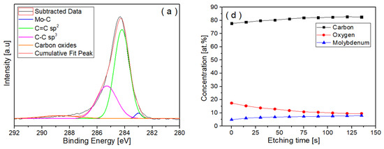 An XPS investigation was conducted to determine the distribution of oxygen and molybdenum in the volume of the films and to obtain additional information about the sp2, sp3, and carbon–oxygen bonds (Figure 7).